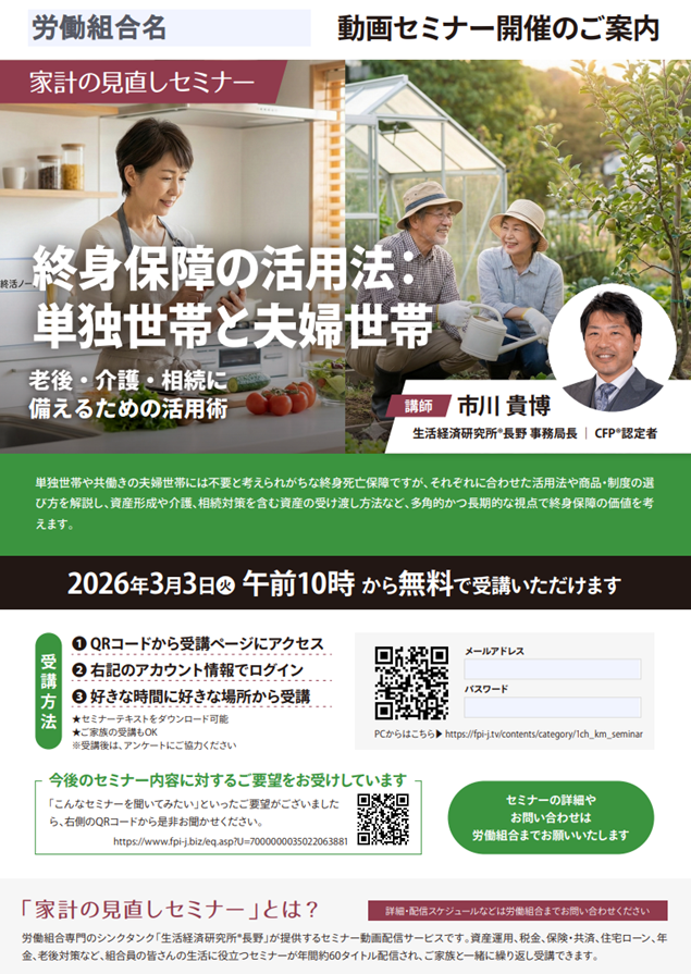 ■お知らせ内容 講師を務める/主催するセミナー ■テーマ 終身保障の活用法:単独世帯と夫婦世帯 講師:市川貴博氏 開催日時:2026年3月3日から ■詳細 弊所、動画配信サイトhttps://fpi-j.tvから前半・後半、各4,400円でご購入いただけます。 ご購入より60日間、視聴可能です。 ■内容: ...