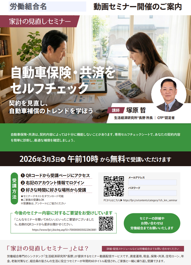 ■テーマ 自動車保険・共済をセルフチェック 講師:塚原哲氏 開催日時:2026年3月3日から ■詳細 弊所、動画配信サイトhttps://fpi-j.tvから前半・後半、各4,400円でご購入いただけます。 ご購入より60日間、視聴可能です。 ■内容: 自動車保険・共済は、契約内容によっては十分に機能しない...