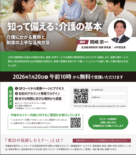 ■内容:公的介護保険の仕組みや認定の流れ、施設・在宅サービスの実際の費用目安を分かりやすく解説します。高額介護サービス費など自己負担を抑える公的制度の活用法や、家族で情報を共有する「介護ノート」についても触れ、賢い介護の備えをお伝えします。